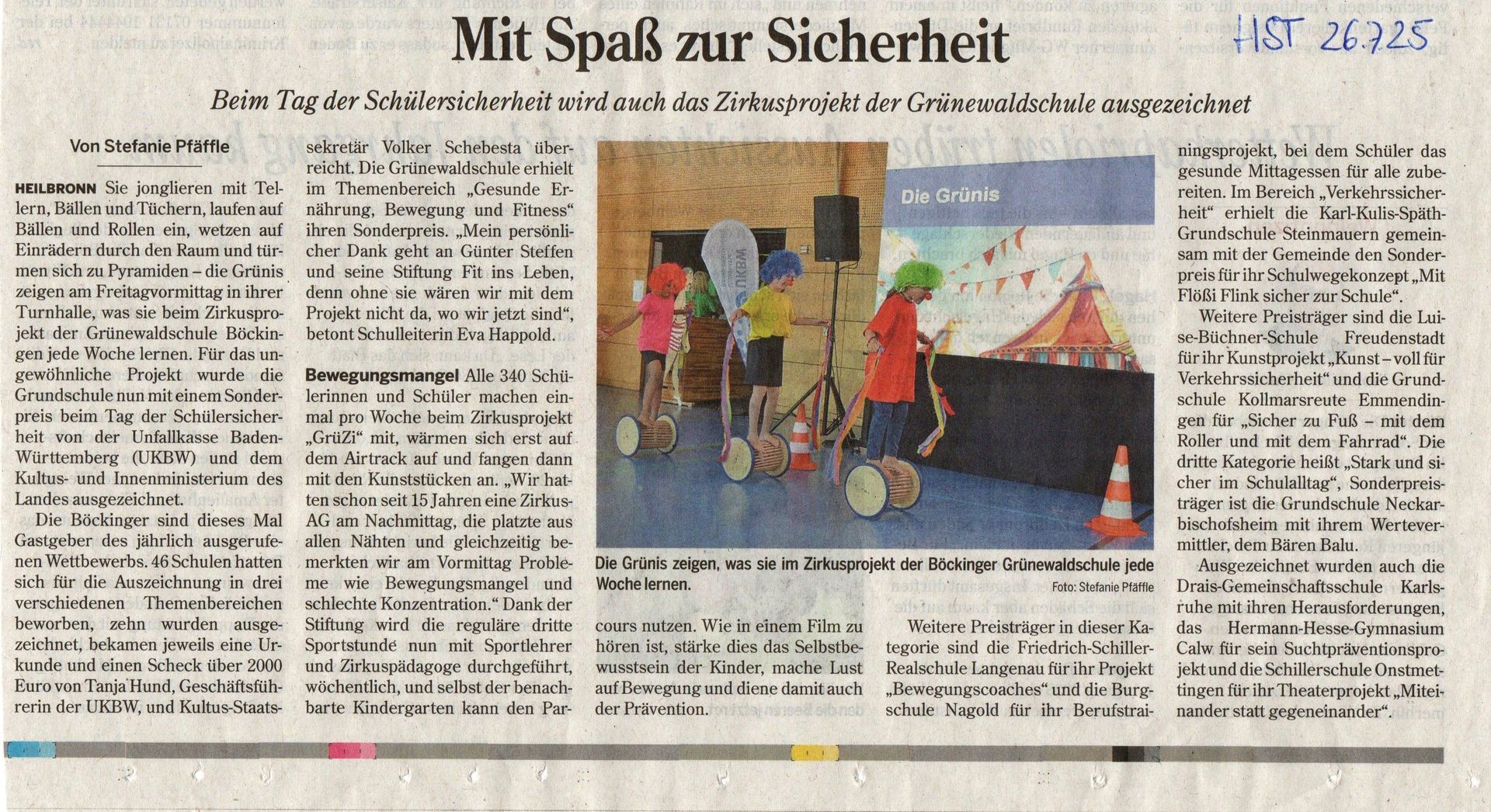 Wie in den Vorjahren besteht das Projekt Grüzi weiterhin. An der Schule werden im Regelunterricht 22 Wochenstunden Sport und Zirkus angeboten. Bezahlt wird die Aktion von der Stadt Heilbronn, die allerdings im Sommer 2019 erneut über die Nichtverlängerung des Projektes nachdachte. Die Intervention der Rektoren, Lehrer und Eltern konnte das Projekt jedoch retten, so dass die Finanzierung der Fixkosten (Personal) sichergestellt war. Erlebnisteam ProSM GmbH & CoKG stellte weiterhin diverse Sportgeräte wie Airtrack, Laufkugeln, Diabolos, Einräder inkl. Materialtransport zur Verfügung.